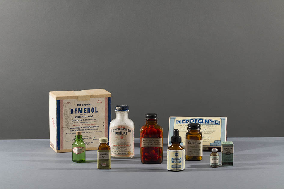 Throughout her life, especially after each of the more than twenty surgeries that she underwent, Frida had to take a variety of analgesics, antibiotics, and food supplements. These bottles are associated with the pharmacology used to address her ailments.
