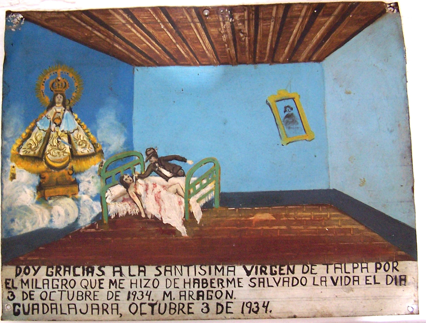 Ex-voto that tells of a man attacking a woman in bed. On the left is the Virgin of Talpa