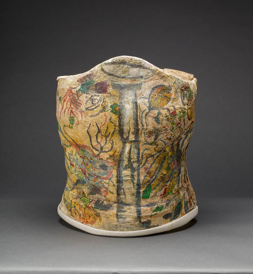 Frida drew a shattered Ionic column on this corset, alluding to her physical frailty. This act reflects how the artist’s creativity, sense of humor, and honesty prevailed throughout her many bouts of convalescence and despite the pain she endured.